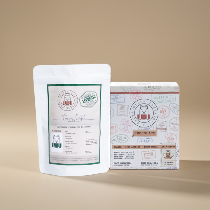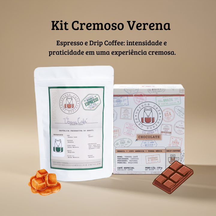 Este kit une o Verena Espresso, nosso café encorpado e aveludado, com o Verena Drip Coffee, a versão prática para preparar onde quiser.